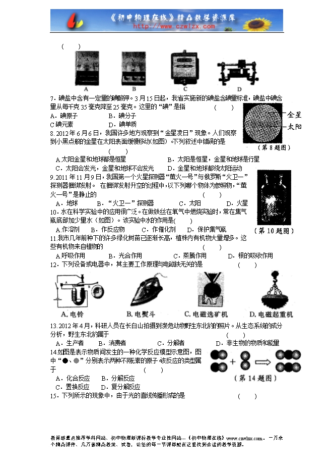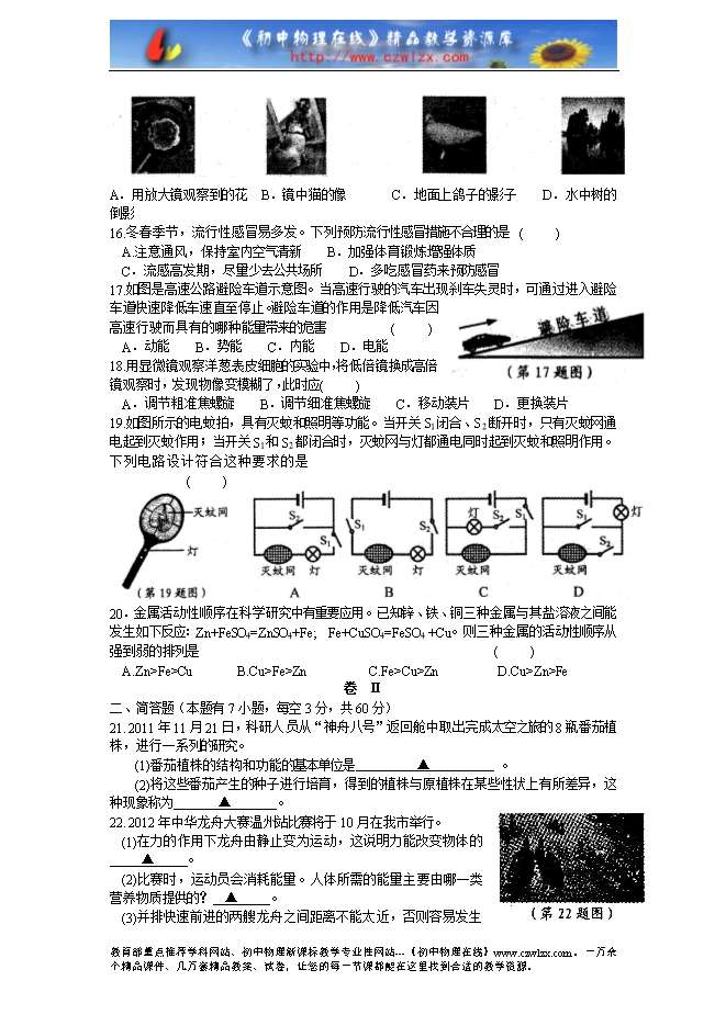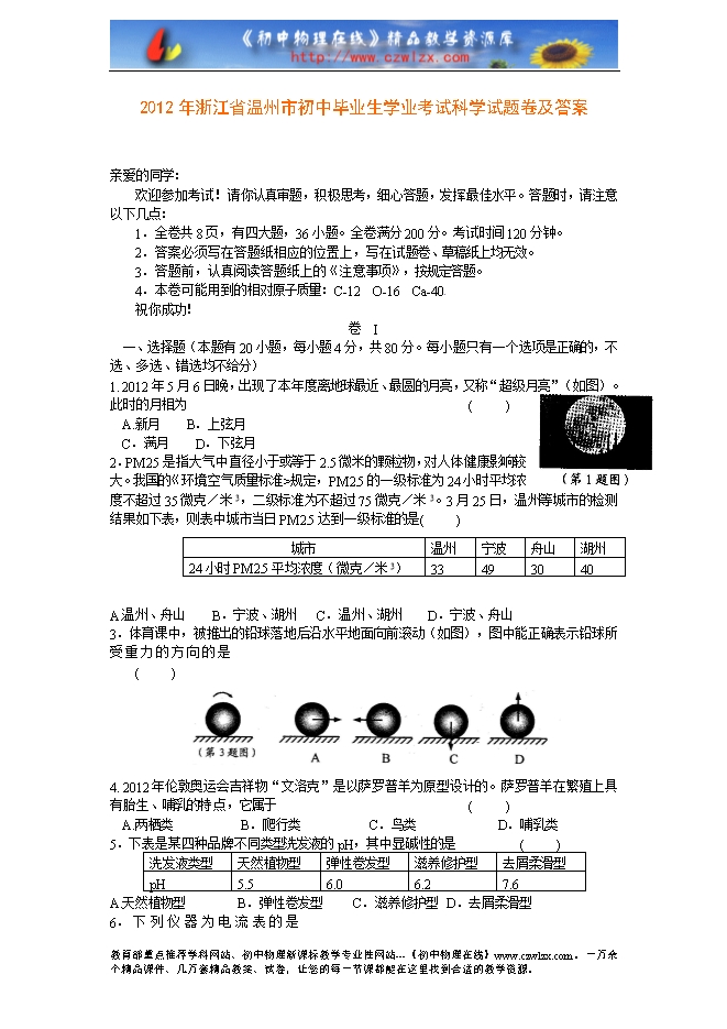 2012年浙江省温州市初中毕业生学业考试科学试题卷及答案