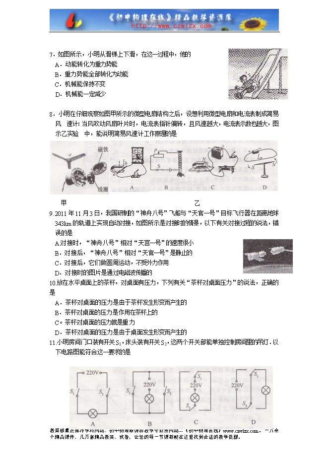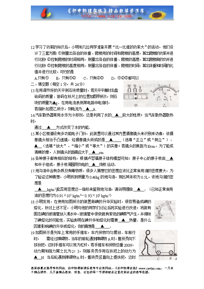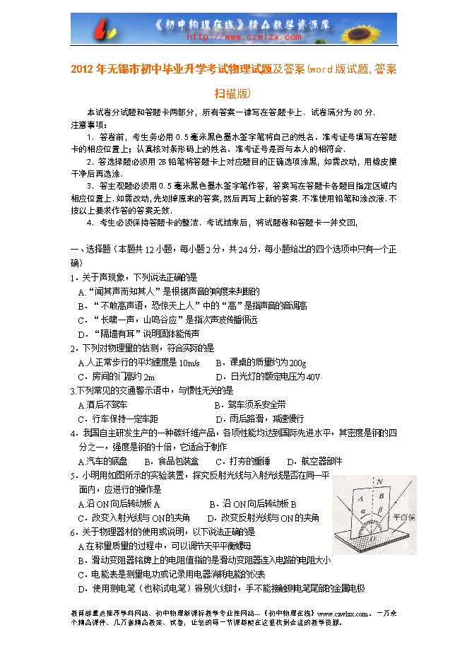 2012年无锡市初中毕业升学考试物理试题及答案(word版试题,答案扫描版)
