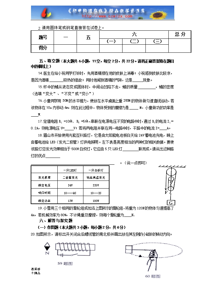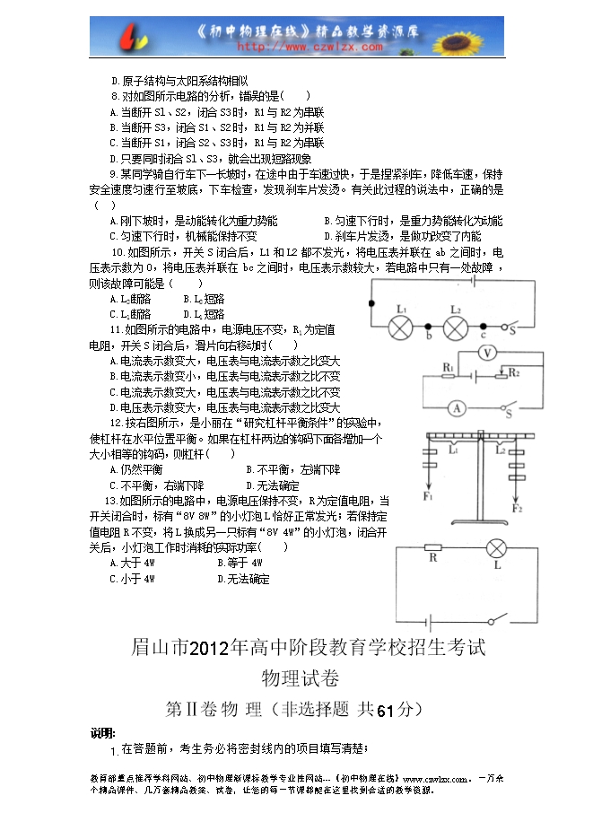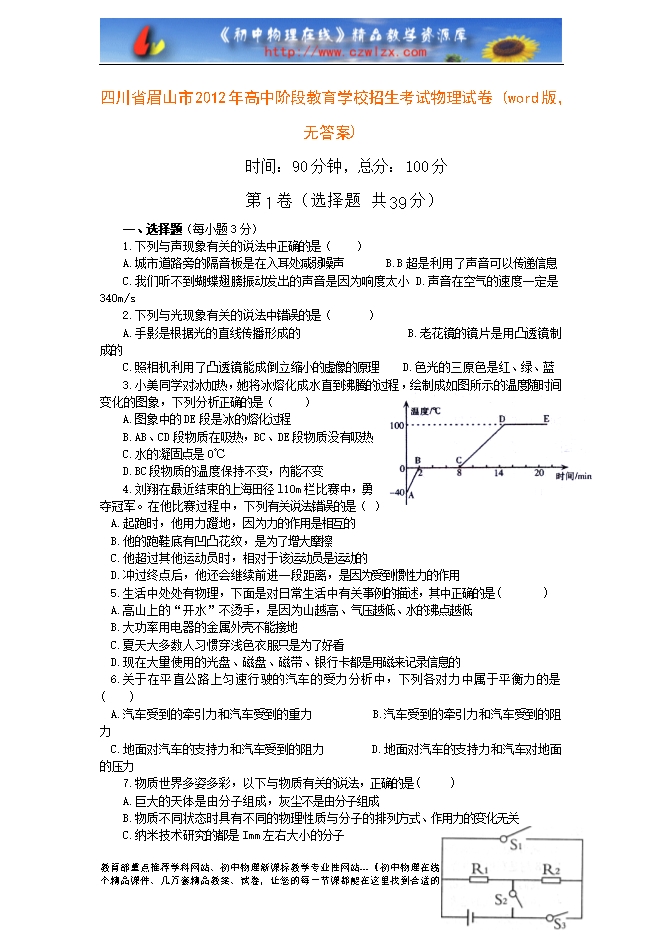 四川省眉山市2012年高中阶段教育学校招生考试物理试卷 (word版,无答案)