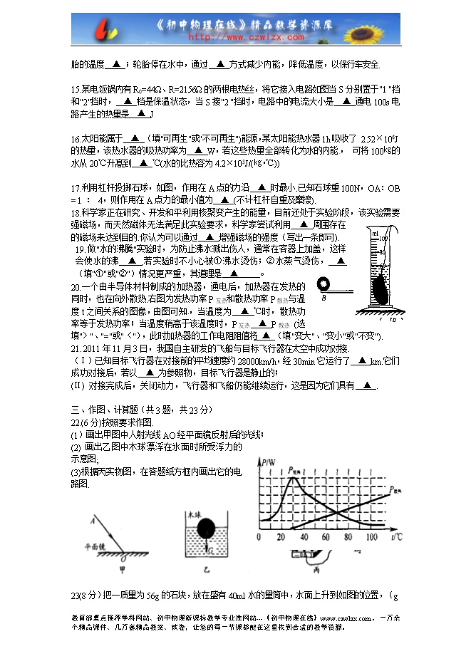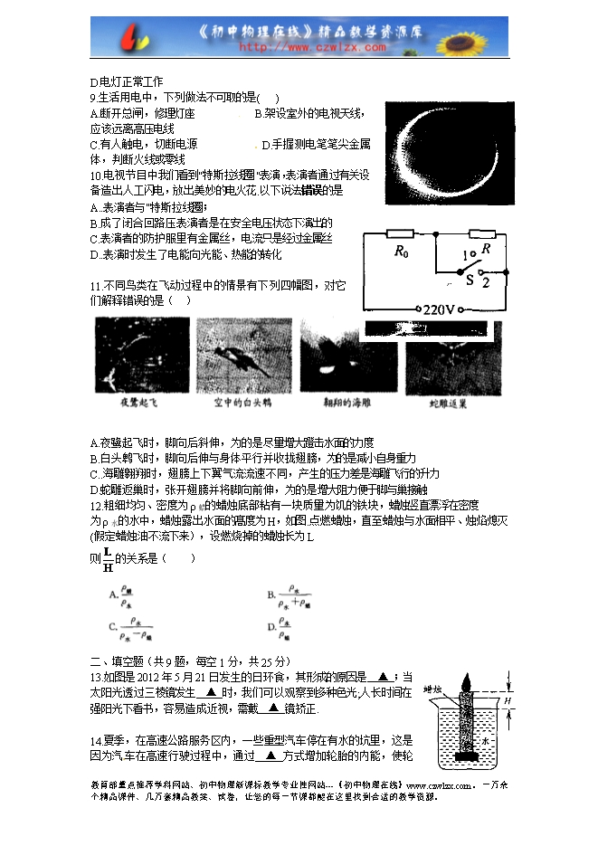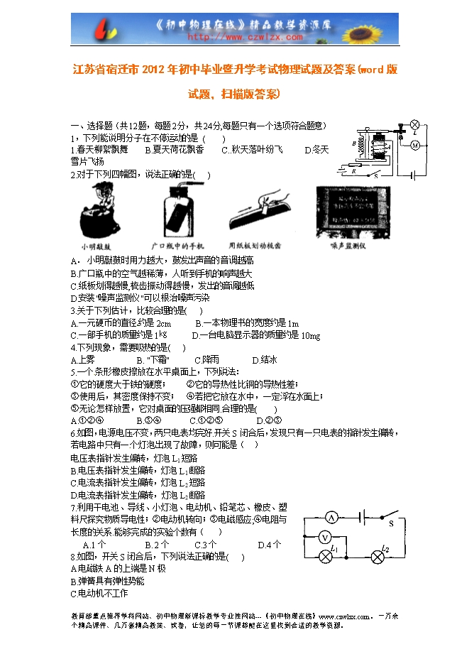 江苏省宿迁市2012年初中毕业暨升学考试物理试题及答案(word版试题,扫描版答案)