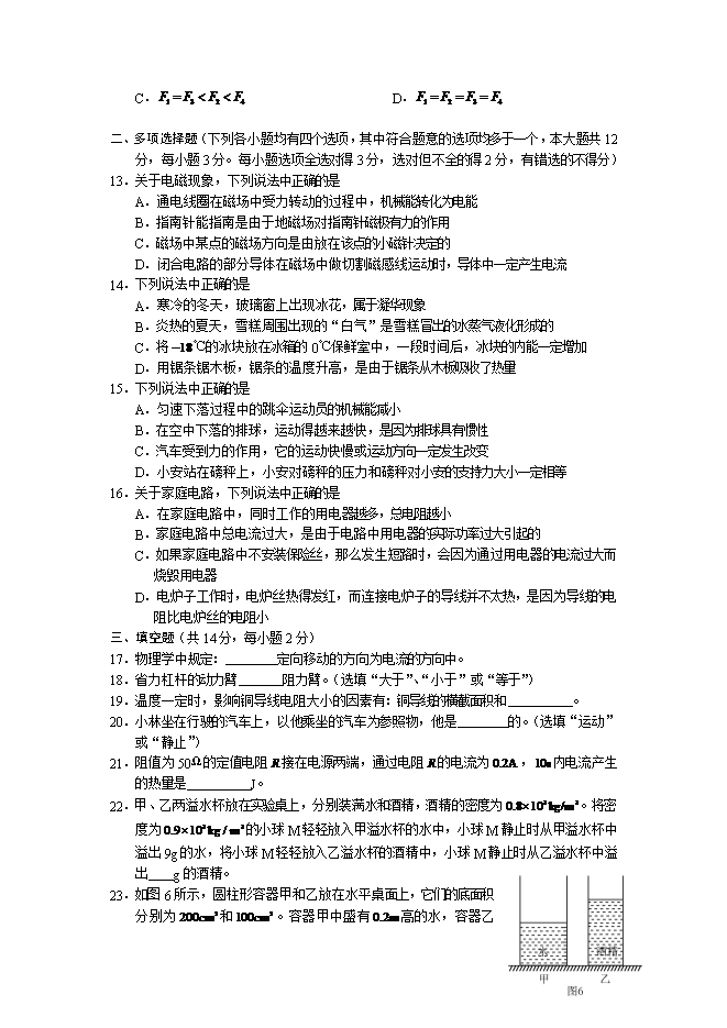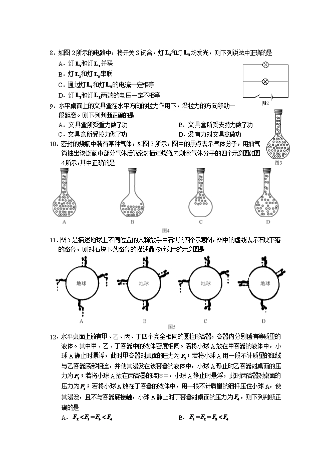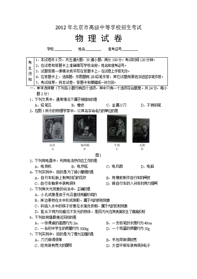 2012年北京市高级中等学校招生考试物理试卷(word版无答案)