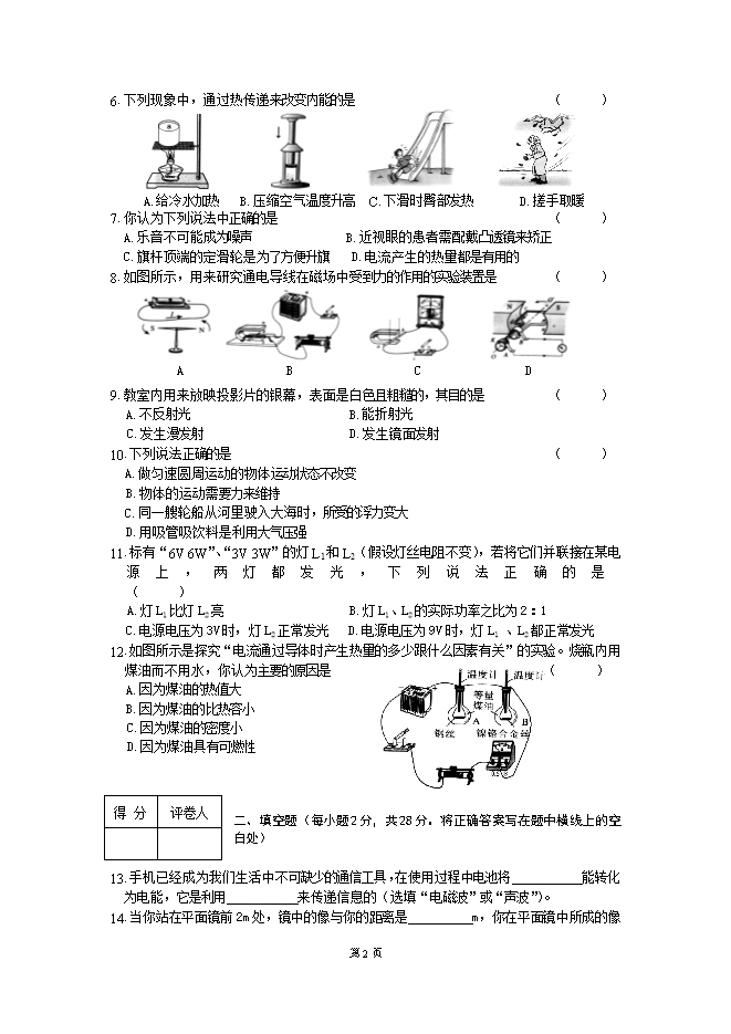 6.下列现象中,通过热传递来改变内能的是 ( )