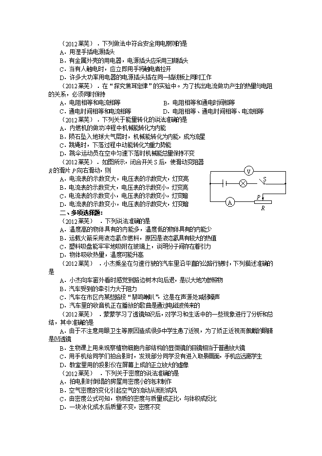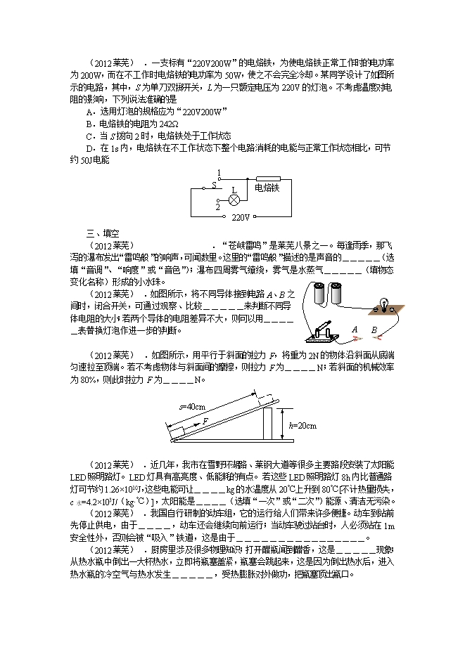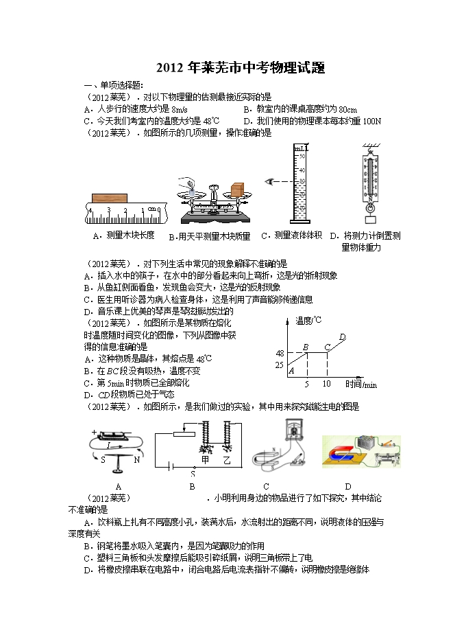 2012年山东省莱芜市中考物理试题及答案(word版)