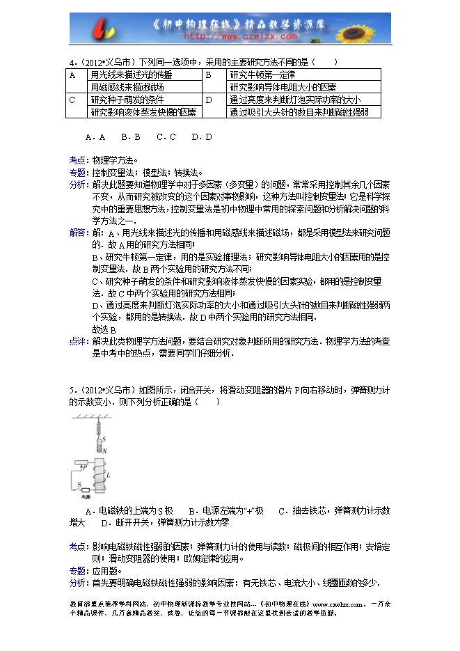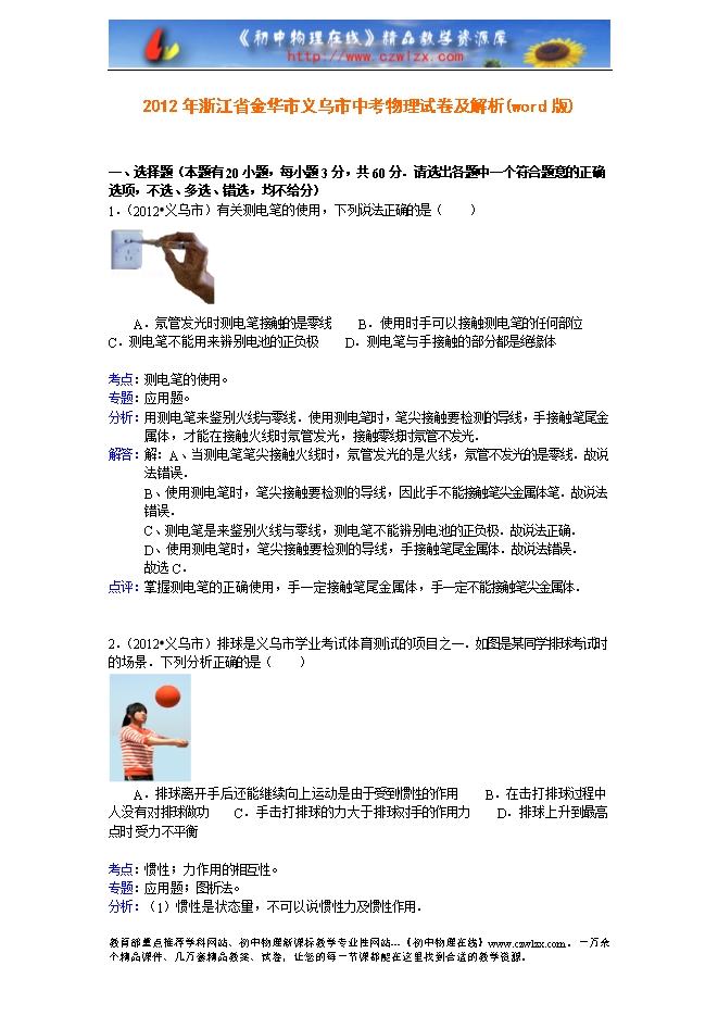 2012年浙江省金华市义乌市中考物理试卷及解析(word版)