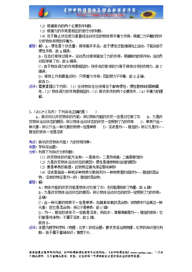 2.(2012•义乌市)排球是义乌市学业考试体育测试的项目之一.如图是某同学排球考试时的场景.下列分析正确的是( )