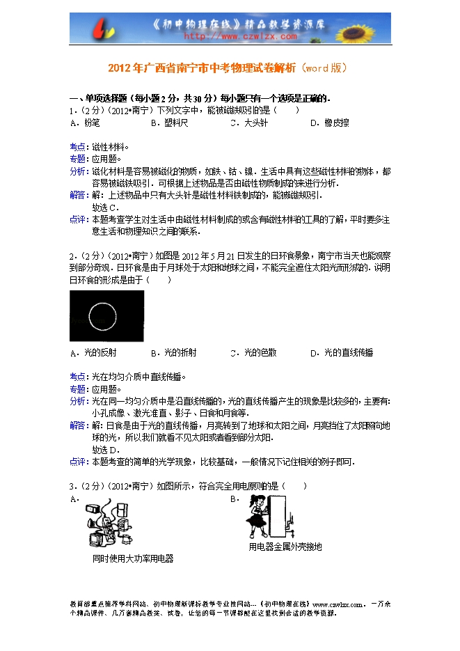 2.(2分)(2012•南宁)如图是2012年5月21日发生的日环食景象,南宁市当天也能观察到部分奇观.日环食是由于月球处于太阳和地球之间,不能完全遮住太阳光而形成的.说明日环食的形成是由于( )