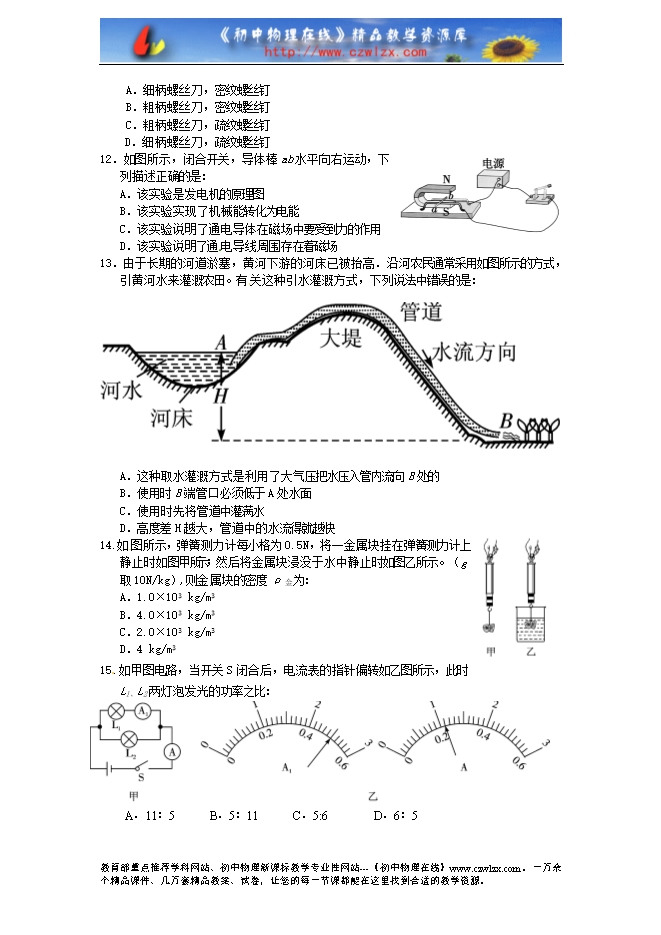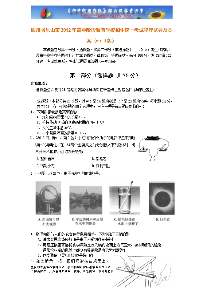 四川省乐山市2012年高中阶段教育学校招生统一考试物理试卷及答案(word版)