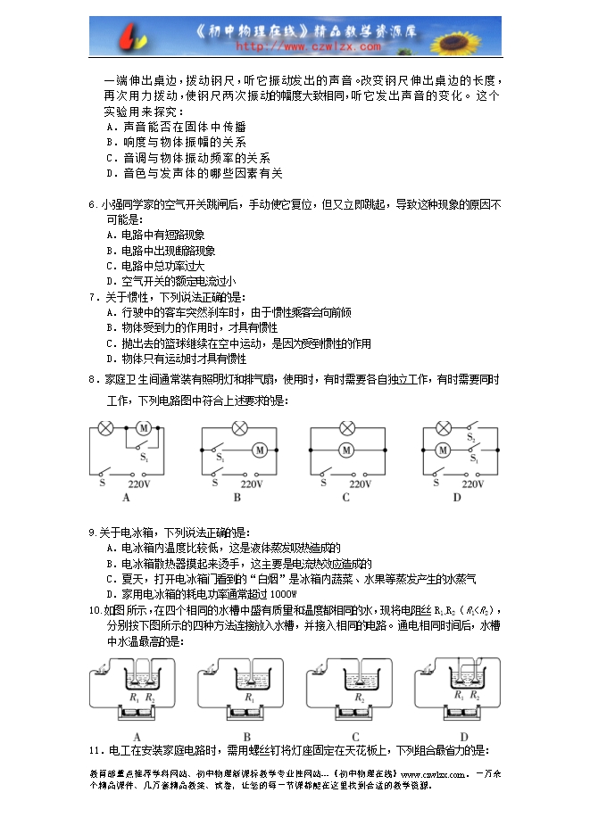 5.如图所示,将一把钢尺紧按在桌面上,一端伸出桌边,拨动钢尺,听它振动发出的声音。改变钢尺伸出桌边的长度,再次用力拨动,使钢尺两次振动的幅度大致相同,听它发出声音的变化。这个实验用来探究: