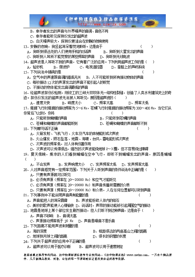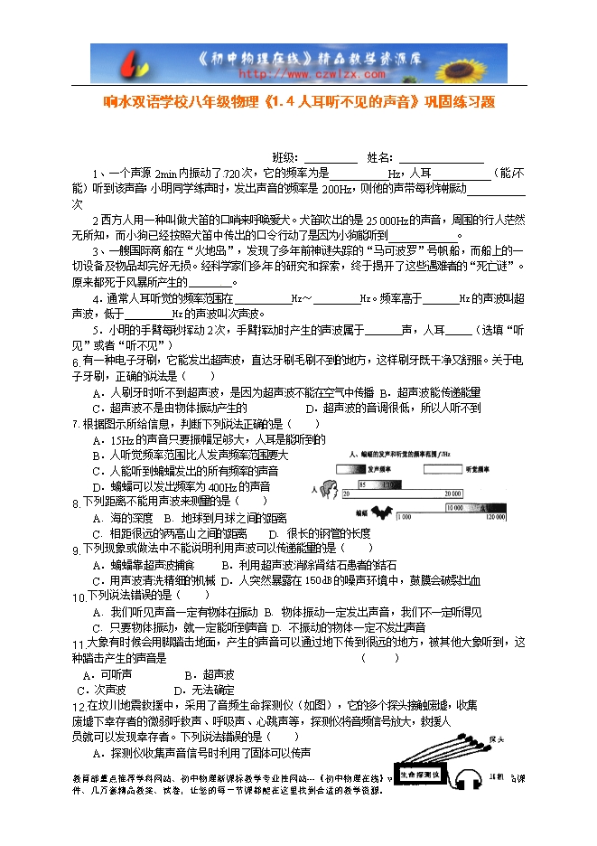 响水双语学校八年级物理《1.4人耳听不见的声音》巩固练习题