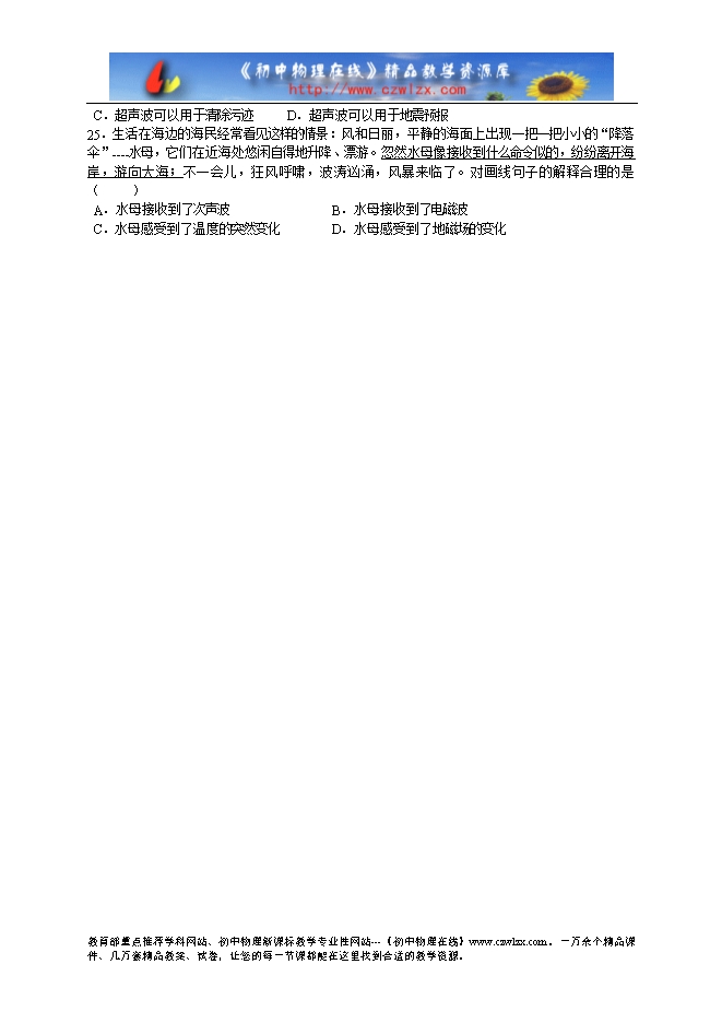 2西方人用一种叫做犬笛的口哨来呼唤爱犬。犬笛吹 出的是25 000Hz的声音,周围的行人茫然无所知,而小狗已经按照犬笛中传出的口令行动了是因为小狗能听到_____________。