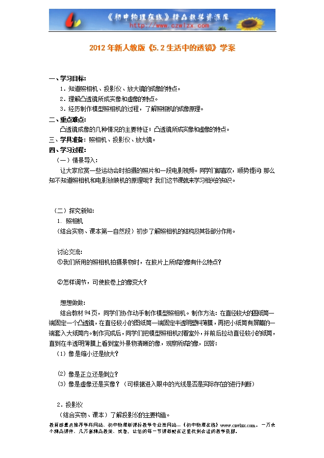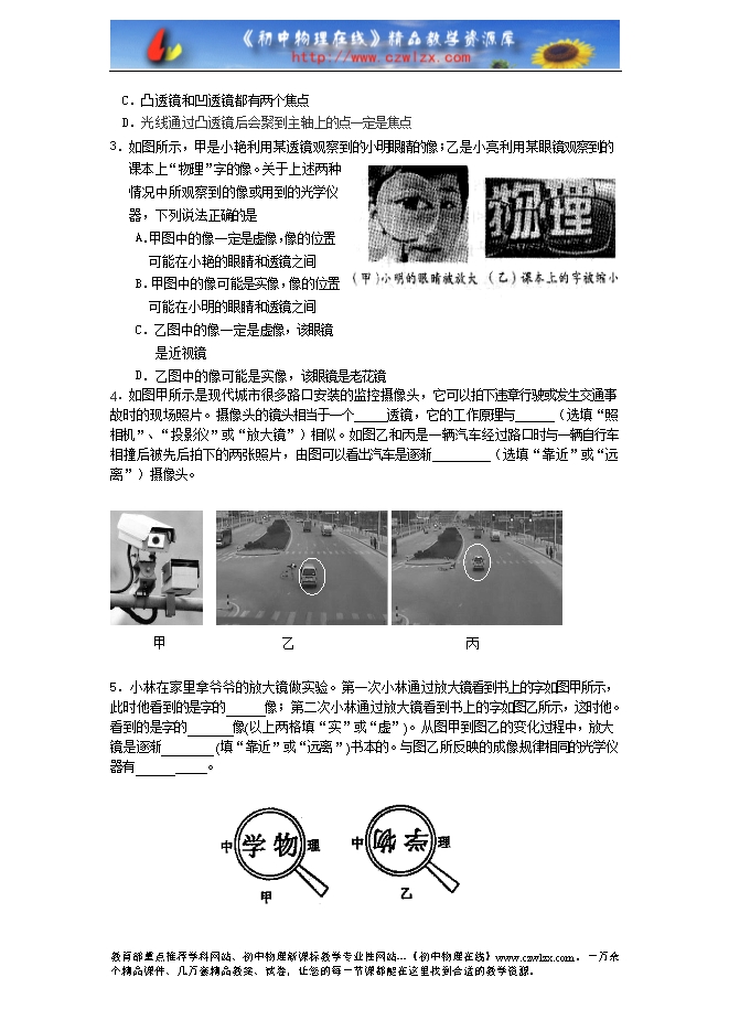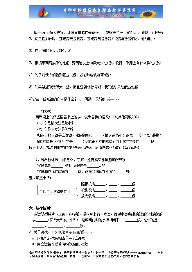 1.知道照相机、投影仪、放大镜的成像的特点。