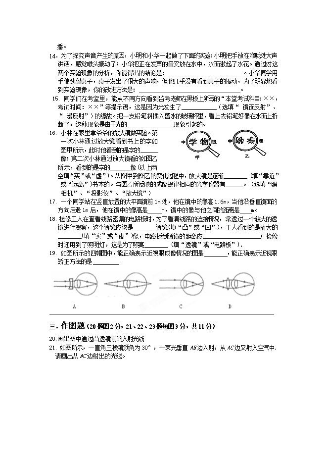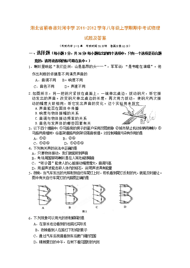 湖北省蕲春县刘河中学2011-2012学年八年级上学期期中考试物理试题及答案