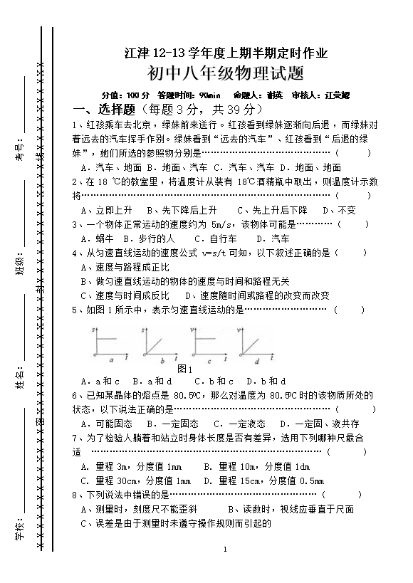 1、红孩乘车去北京,绿妹前来送行。红孩看到绿妹逐渐向后退,而绿妹对着远去的汽车挥手作别。绿妹看到“远去的汽车”、红孩看到“后退的绿妹”,她们所选的参照物分别是……………………………………( )
