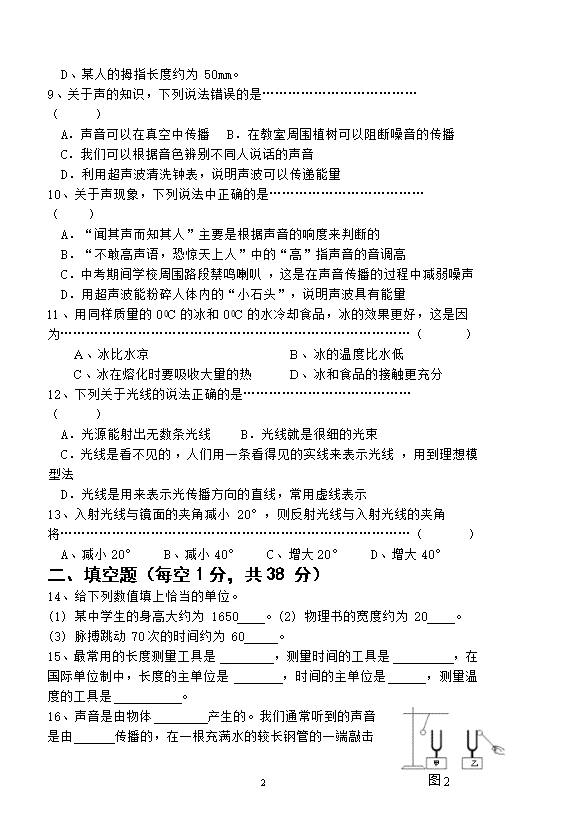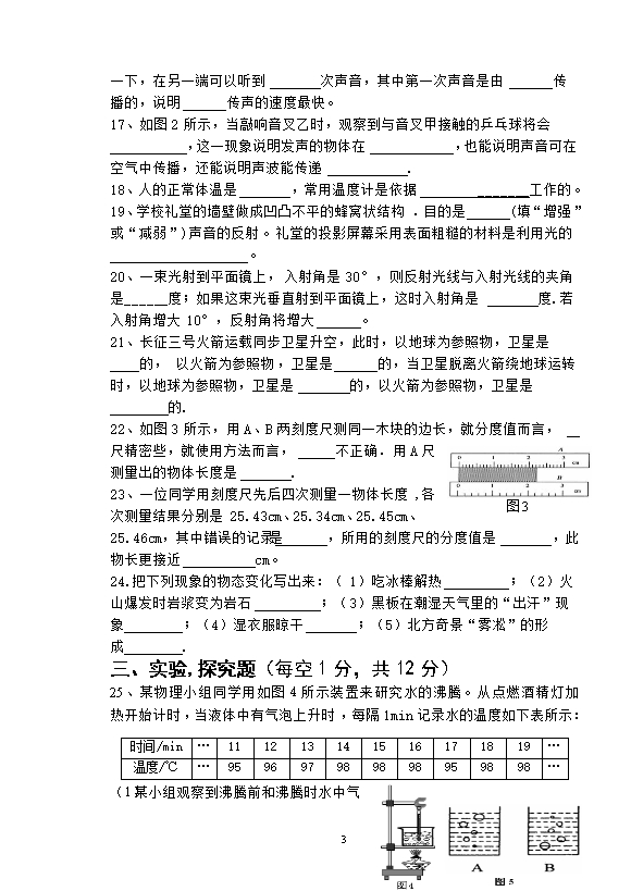 2、在18 ℃的教室里,将温度计从装有18℃酒精瓶中取出,则温度计示数将………………………………………………………………………( )