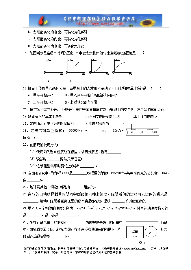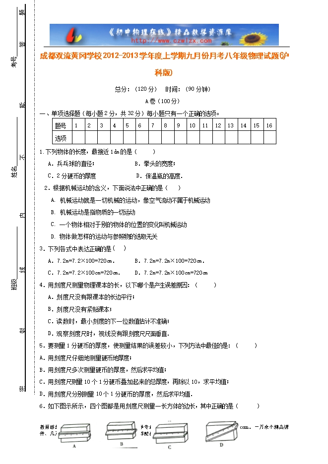 成都双流黄冈学校2012-2013学年度上学期九月份月考八年级物理试题(沪科版)