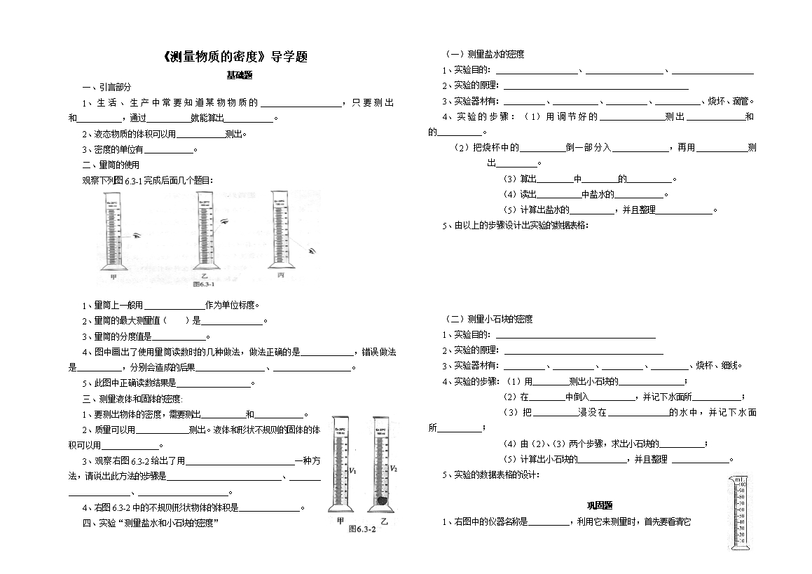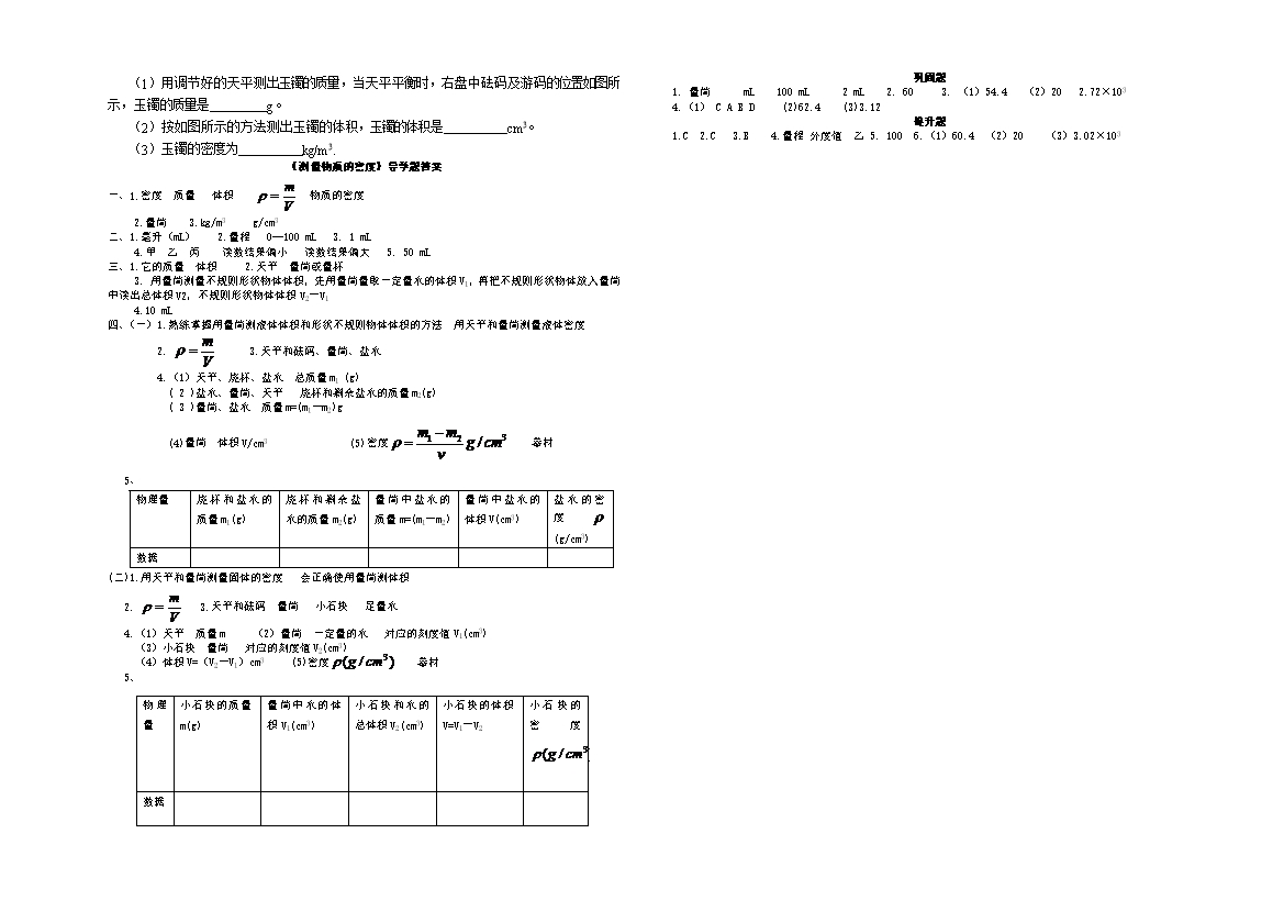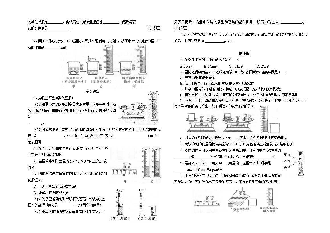 2、质量可以用 测出。液体和形状不规则的固体的体积可以用 。