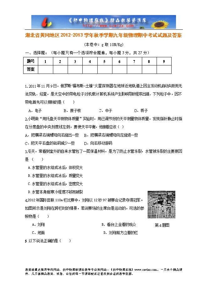 湖北省黄冈地区2012-2013学年秋季学期九年级物理期中考试试题及答案
