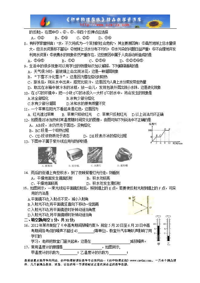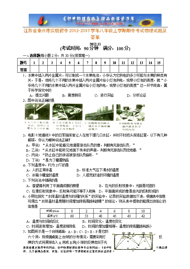 江苏省泰兴市实验初中2012-2013学年八年级上学期期中考试物理试题及答案