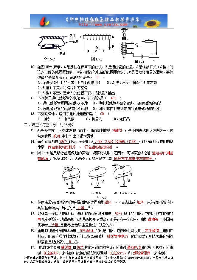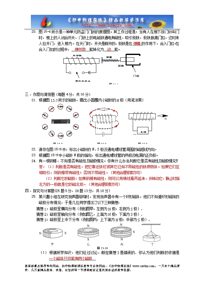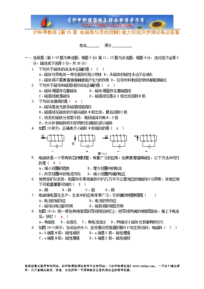 沪科粤教版《第15章 电磁铁与自动控制》能力形成同步测试卷及答案