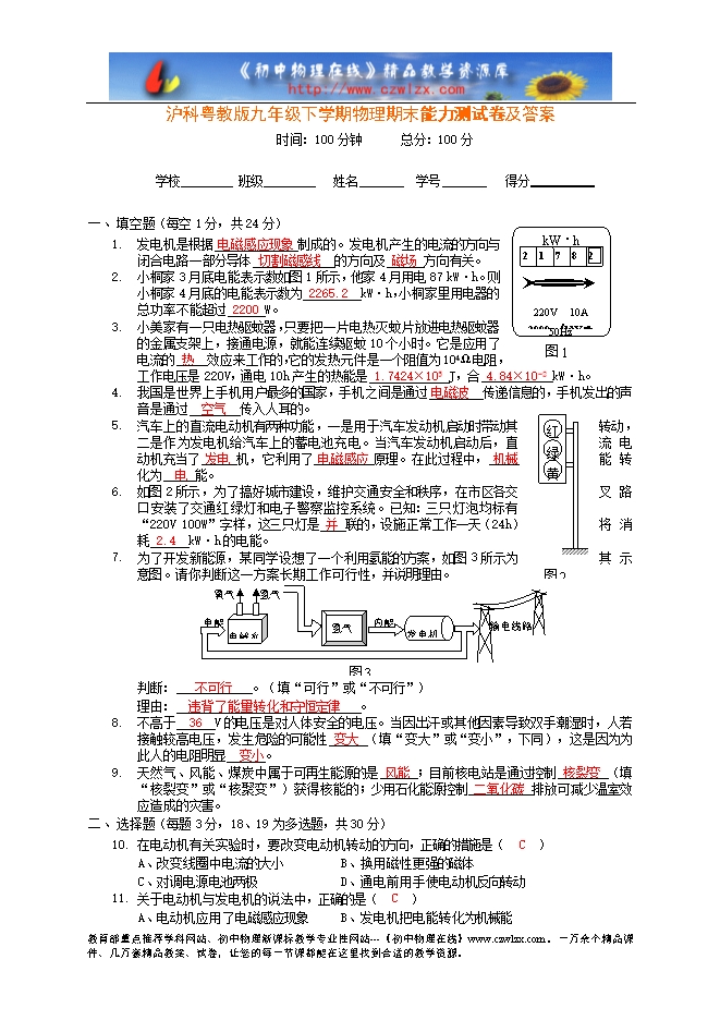 沪科粤教版九年级下学期物理期末能力测试卷及答案