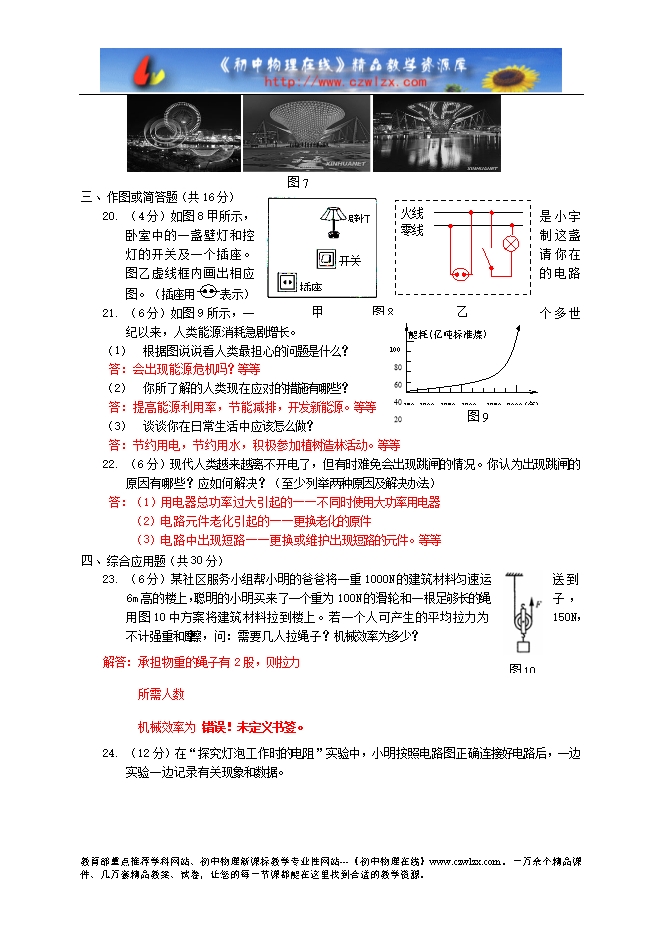 6. 如图2所示,为了搞好城市建设,维护交通安全和秩序,在市区各交叉路口安装了交通红绿灯和电子警察监控系统。已知:三只灯泡均标有“220V 100W”字样,这三只灯是 并 联的,设施正常工作一天(24h)将消耗 2.4 kW?h的电能。