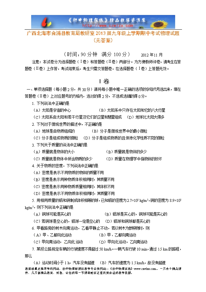广西北海市合浦县教育局教研室2013届九年级上学期期中考试物理试题(无答案)