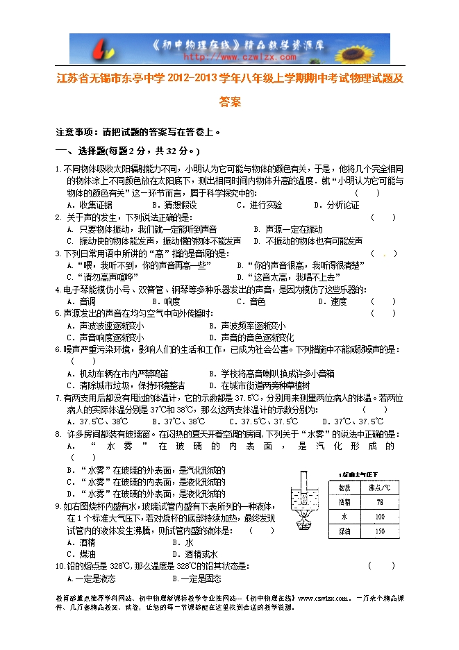 江苏省无锡市东亭中学2012-2013学年八年级上学期期中考试物理试题及答案