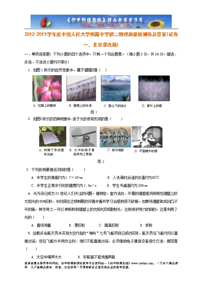 2012-2013学年度中国人民大学附属中学初二物理质量检测卷及答案(试卷一,北京课改版)