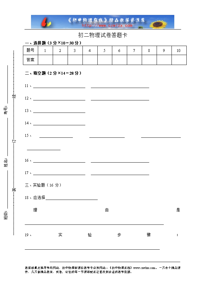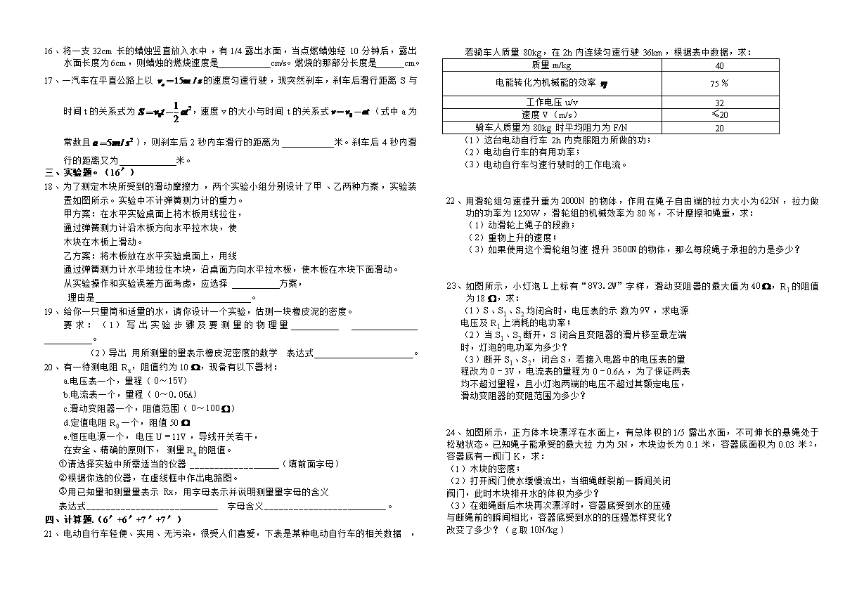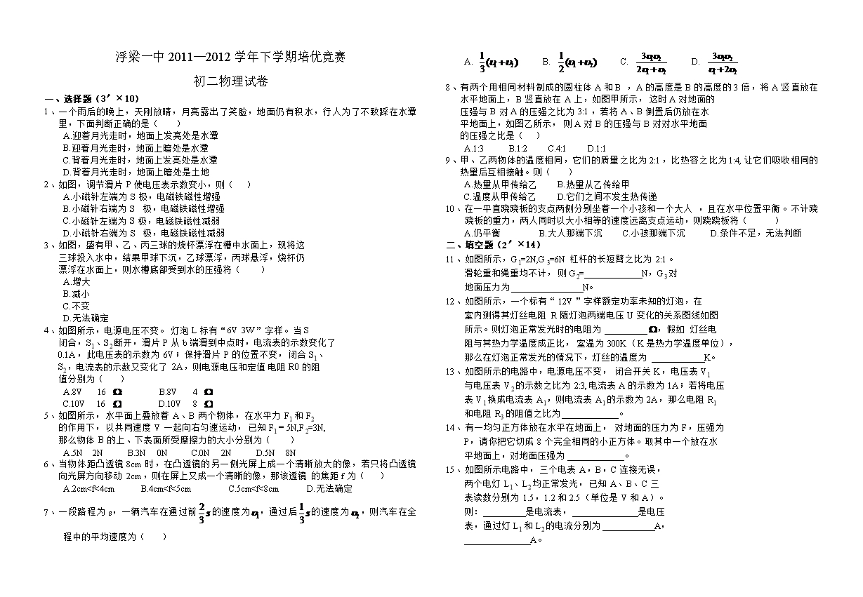 江西浮梁一中2011—2012学年下学期培优竞赛初二物理试卷(无答案)