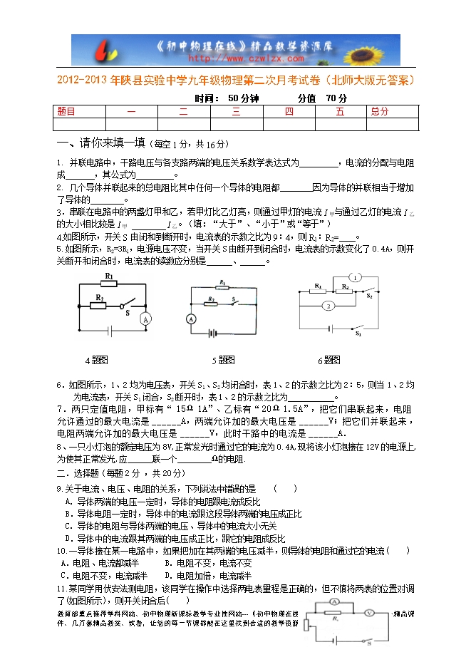 2012-2013年陕县实验中学九年级物理第二次月考试卷(北师大版无答案)