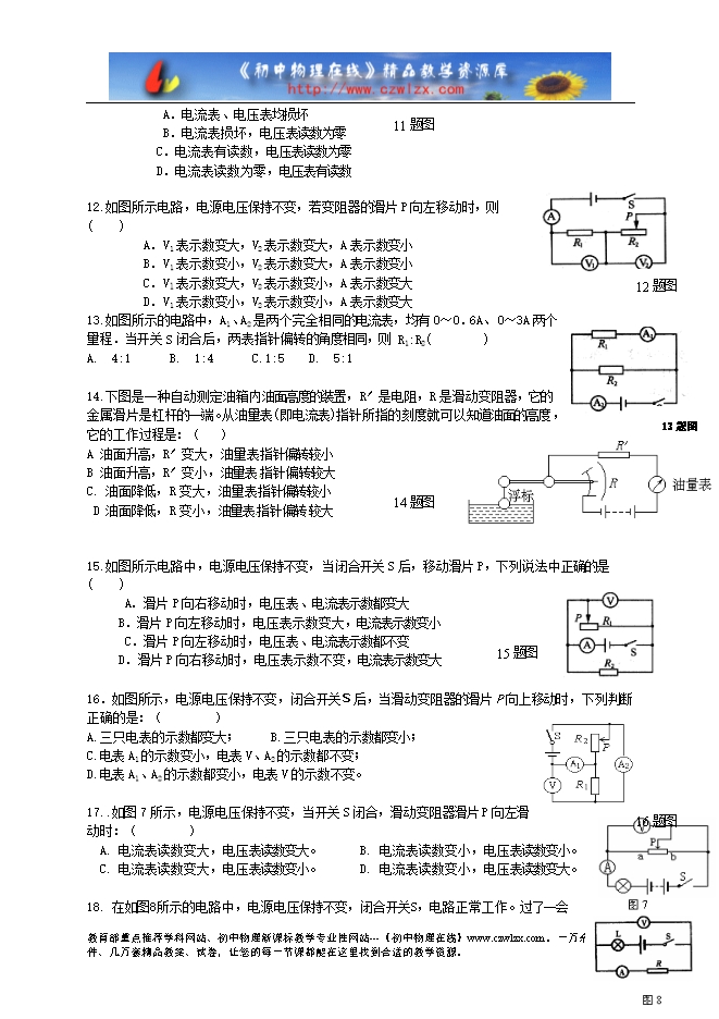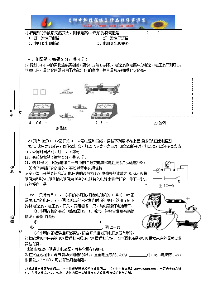 8、一只小灯泡的额定电压为8V,正常发光时通过它的电流为0.4A,现将该小灯泡接在12V的电源上,为使其正常发光,应______联一个________Ω的电阻.二.选择题(每题2分 ,共20分)