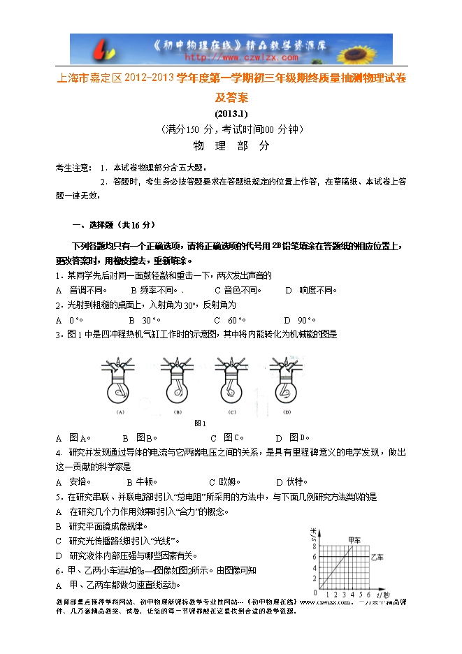 上海市嘉定区2012-2013学年度第一学期初三年级期终质量抽测物理试卷及答案