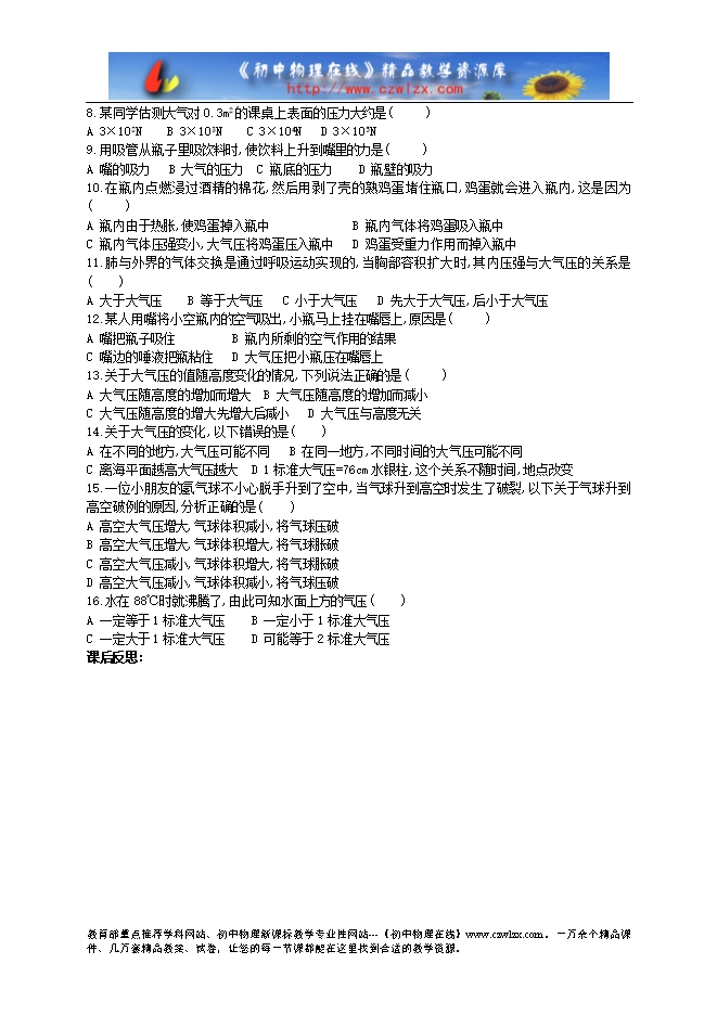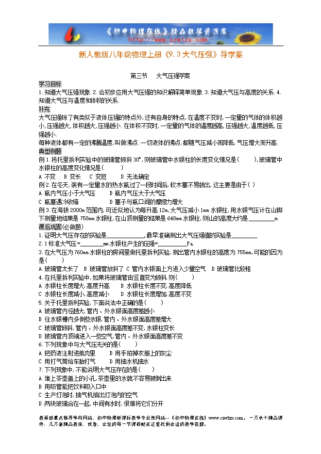 1.知道大气压强现象.2.会初步应用大气压强的知识解释简单现象.3.知道大气压与高度的关系.4.知道大气压与温度和体积的关系.