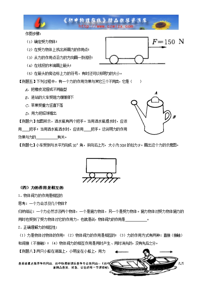 (2)力不能脱离物体单独存在:力至少跟两个物体有关(一个施力物体、一个受力物体),单独一个物体不能产生力的作用,即力是物体对物体的运动。