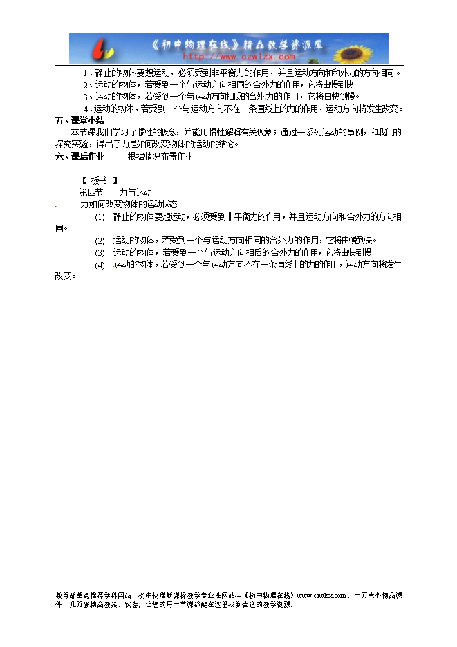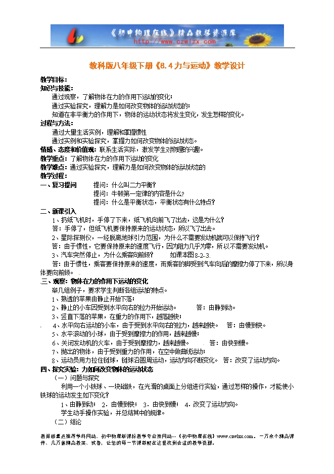 教学重点:了解物体在力的作用下运动的变化