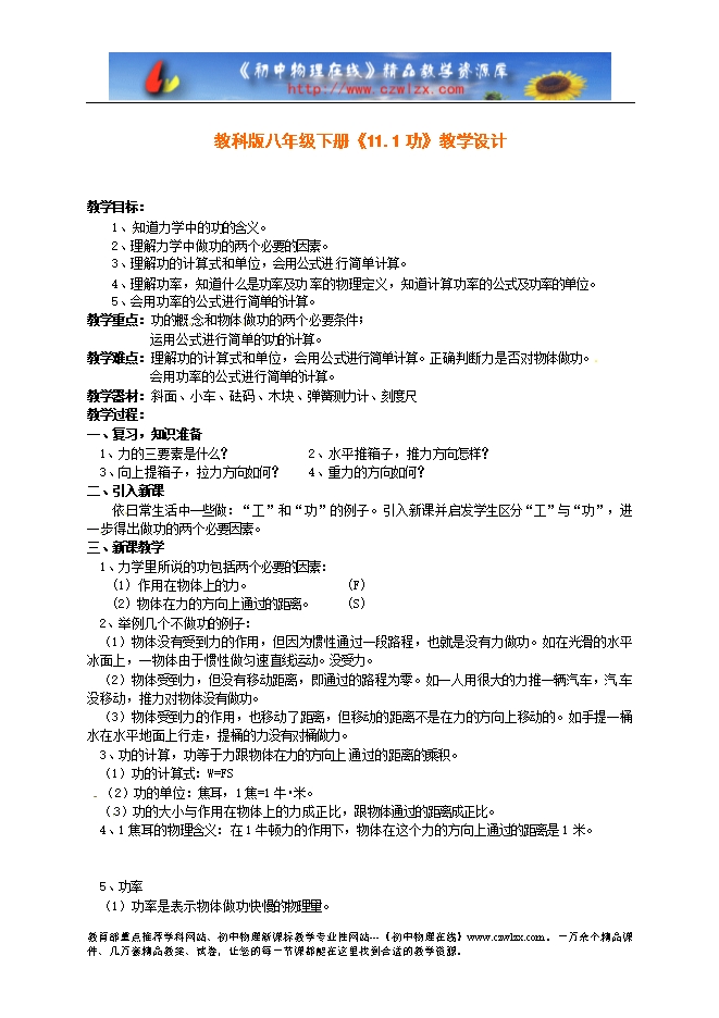教学难点:理解功的计算式和单位,会用公式进行简单计算。正确判断力是否对物体做功。