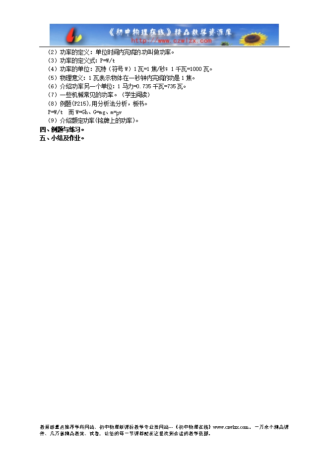 4、理解功率,知道什么是功率及功 率的物理定义,知道计算功率的公式及功率的单位。
