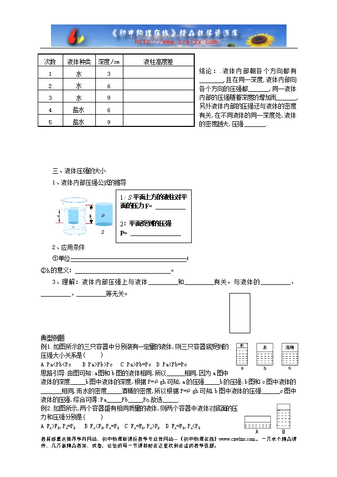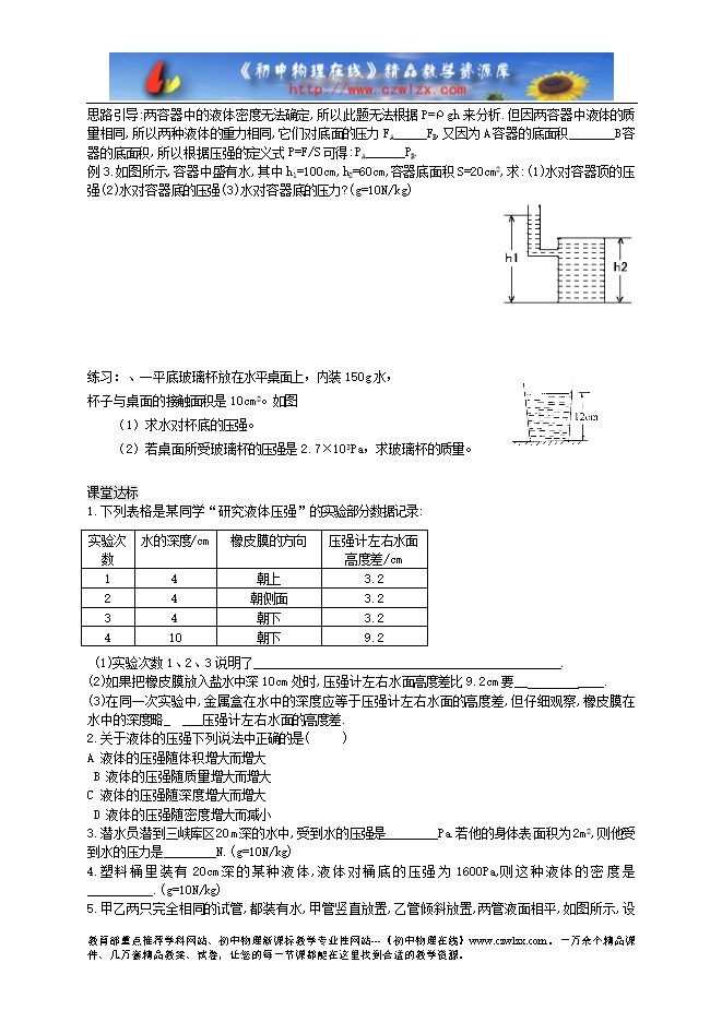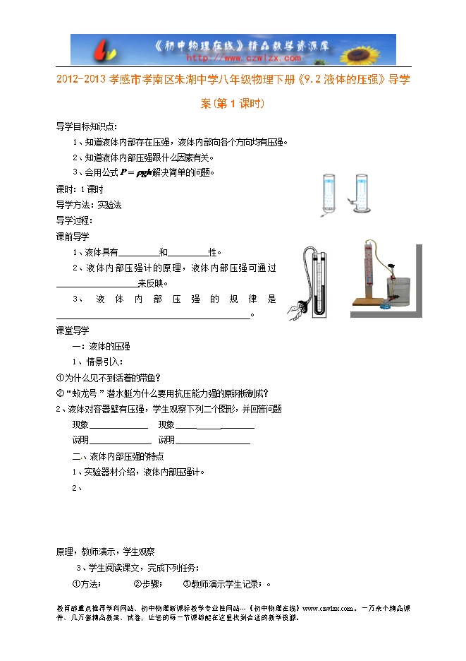 2012-2013孝感市孝南区朱湖中学八年级物理下册《9.2液体的压强》导学案(第1课时)