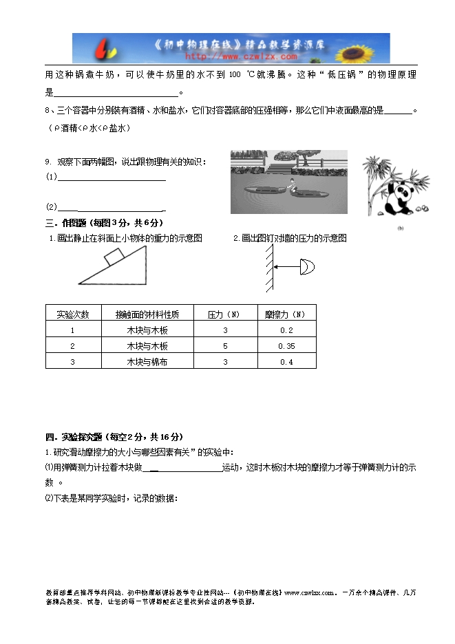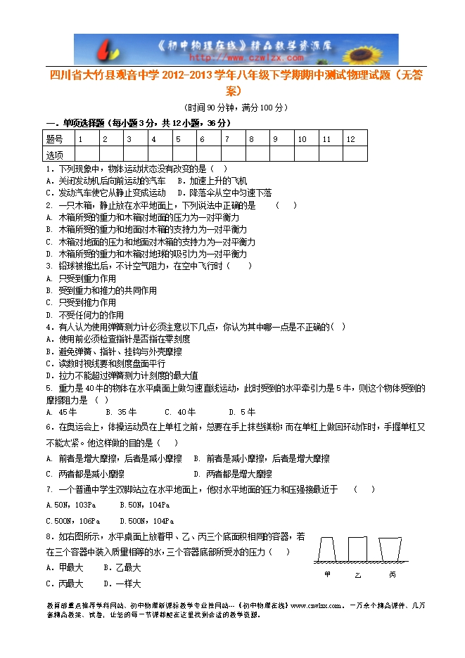 四川省大竹县观音中学2012-2013学年八年级下学期期中测试物理试题(无答案)
