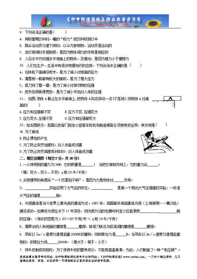 7. 一个普通中学生双脚站立在水平地面上,他对水平地面的压力和压强接最近于 ( )