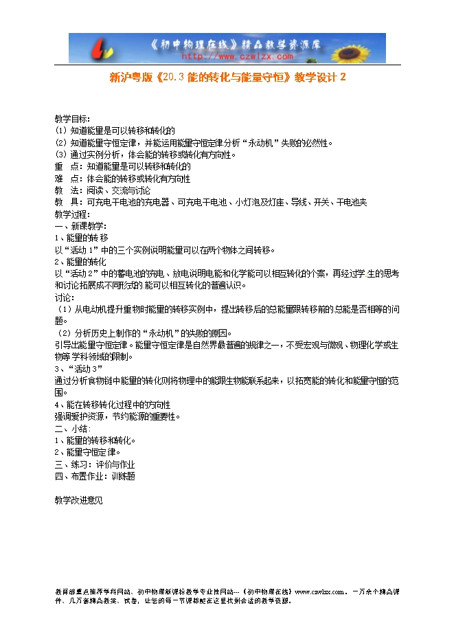 新沪粤版《20.3能的转化与能量守恒》教学设计2