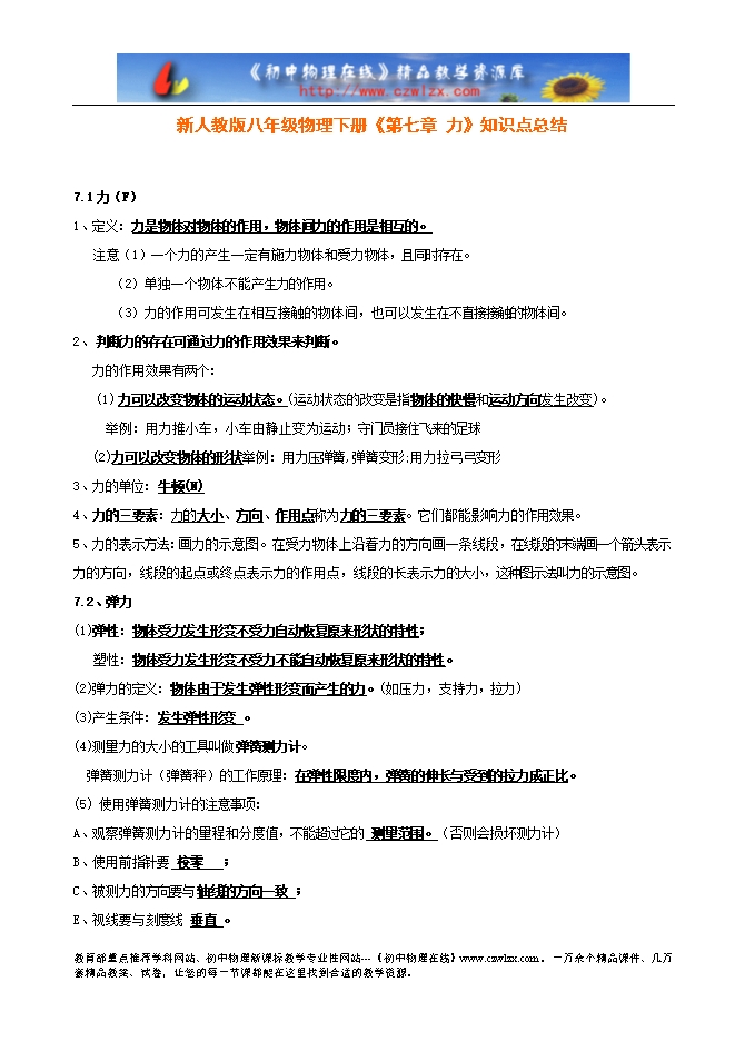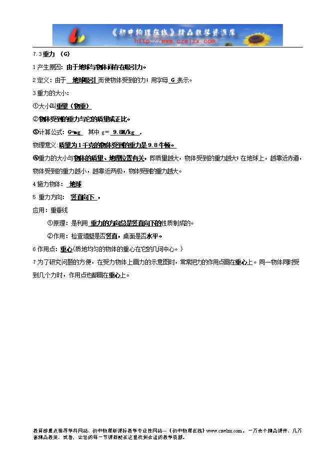 5、力的表示方法:画力的示意图。在受力物体上沿着力的方向画一条线段,在线段的末端画一个箭头表示力的方向,线段的起点或终点表示力的作用点,线段的长表示力的大小,这种图示法叫力的示意图。