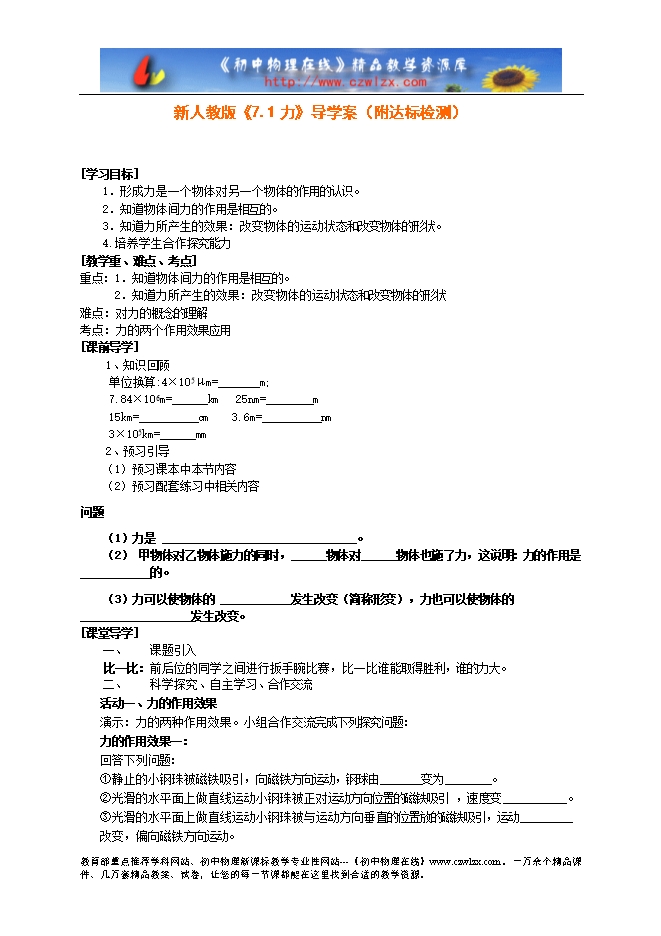 2.知道力所产生的效果:改变物体的运动状态和改变物体的形状