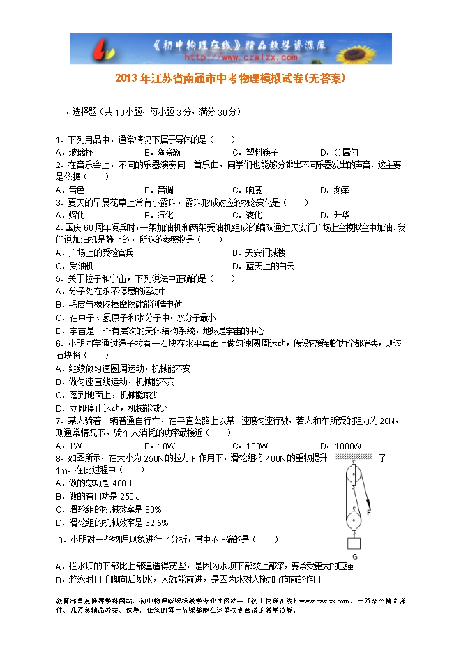 2013年江苏省南通市中考物理模拟试卷(无答案)