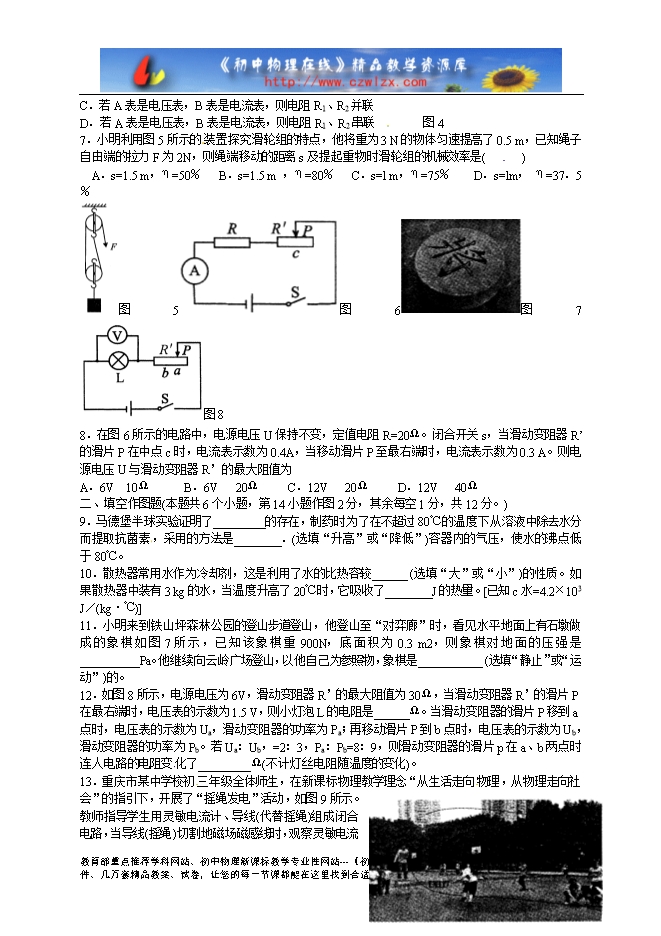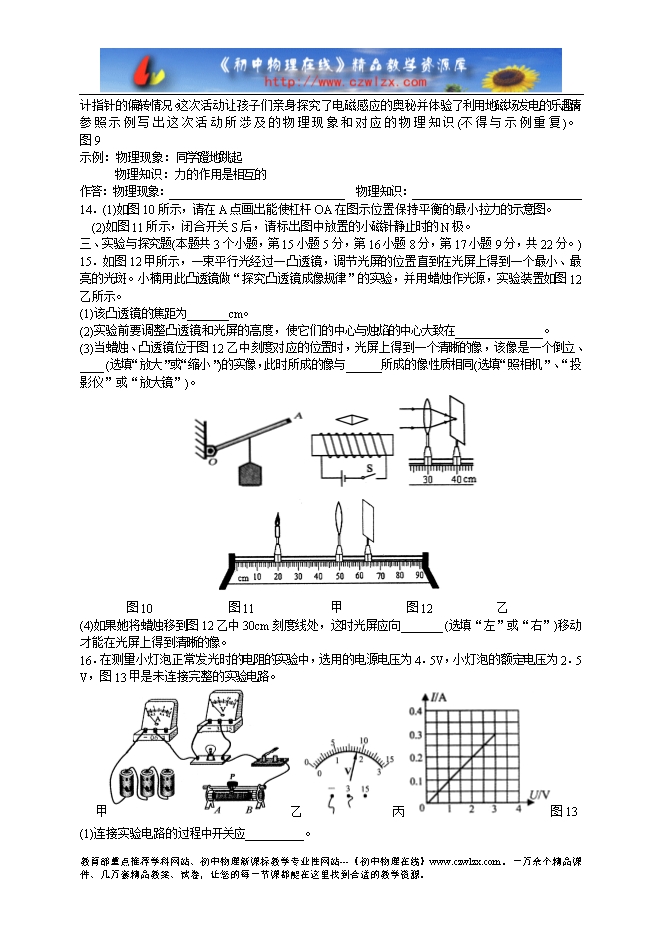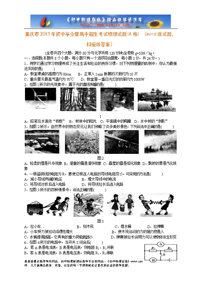 重庆市2013年初中毕业暨高中招生考试物理试题(A卷) (word版试题,扫描版答案)