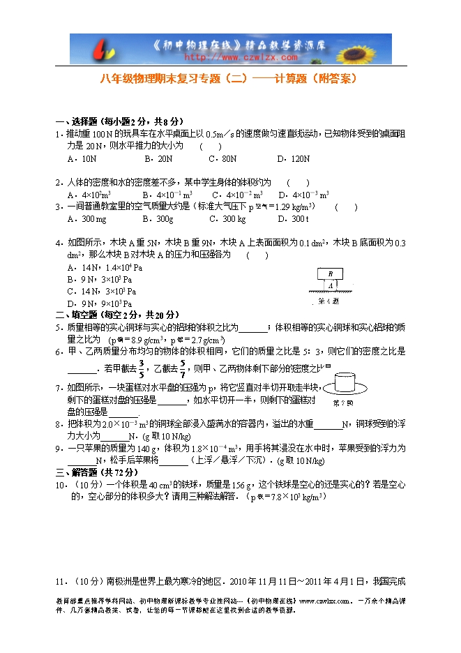 3.一间普通教室里的空气质量大约是(标准大气压下p空气=1.29 kg/m3) ( )