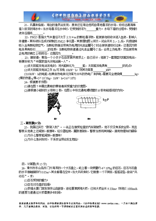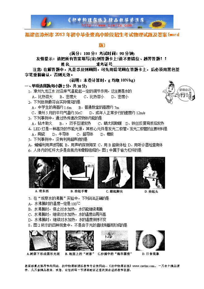 福建省漳州市2013年初中毕业暨高中阶段招生考试物理试题及答案(word版)