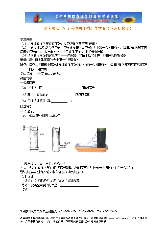 新人教版《9.2液体的压强》导学案(附达标检测)