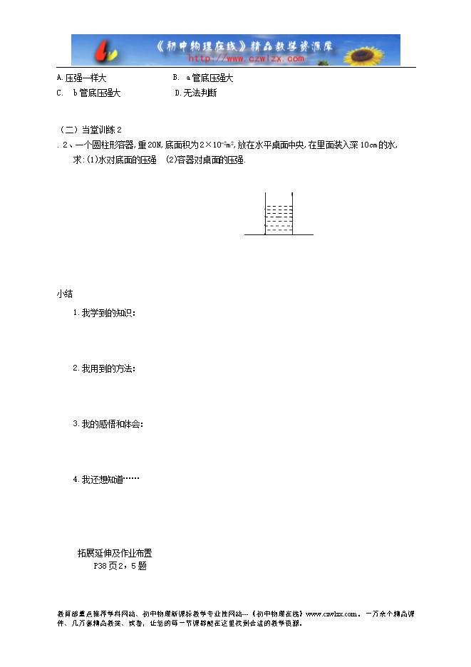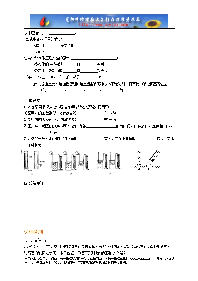 (2)、通过探究活动会使用微小压强计知道液体压强的大小跟什么因素有关,知道液体内部不同深度处压强的大小和方向。学会应用液体压强公式进行分析计算.