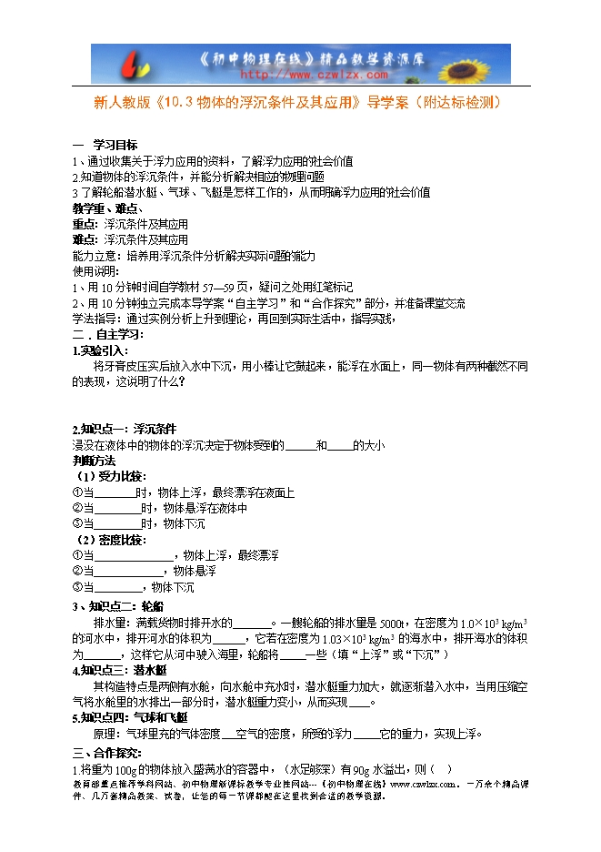 新人教版《10.3物体的浮沉条件及其应用》导学案(附达标检测)